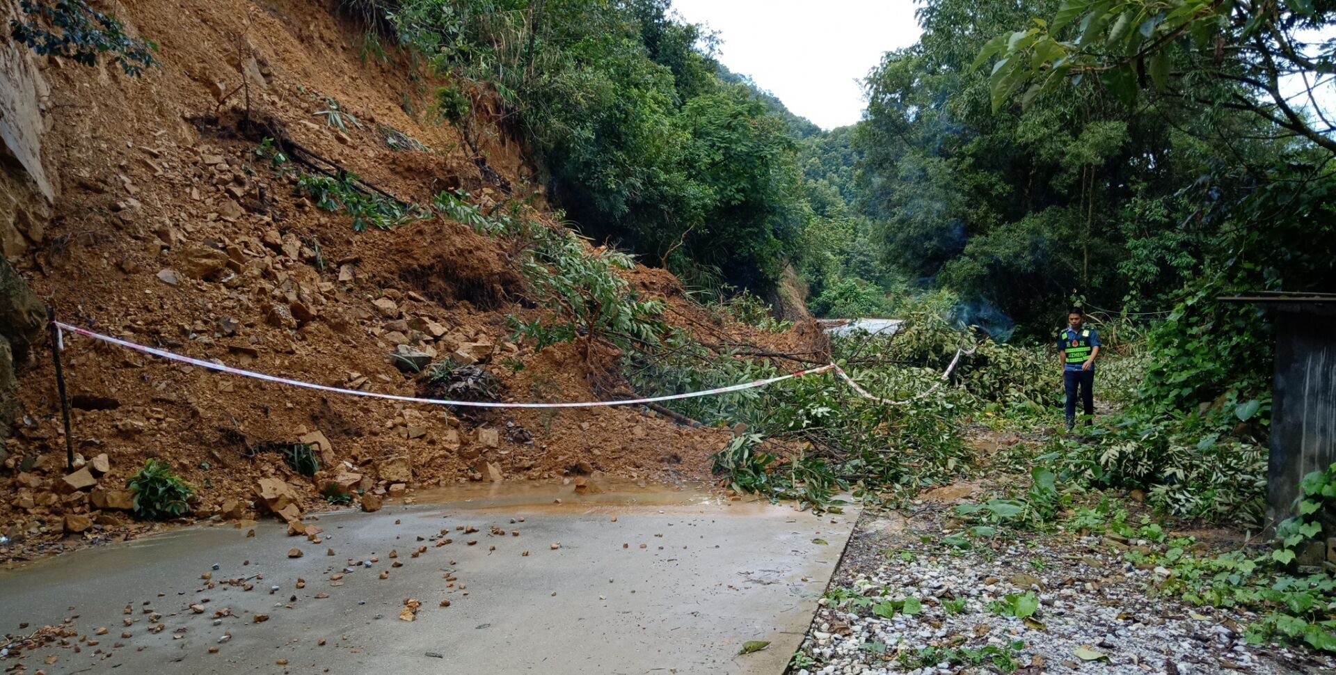 2018年8月2日15:10,隆林公路管理局管养的省道217线旧州-富宁K65+130,K67+430(原村道C043线松树林-平利K0+800与K3+100处)位于隆林县介廷乡平利村路段,因连降暴雨引起上边坡滑坡导致交通中断,塌方、泥石流覆盖全幅路面约3000立方米。无车辆人员滞留。已在路段两头设置好交通告示牌及安全标志,该路段无绕行路线。目前养护部门正在组织机械、人工抢通。由于持续降雨,上边坡不稳定,养护部门抢通难度较大,预计2018年8月6日17时恢复通车。