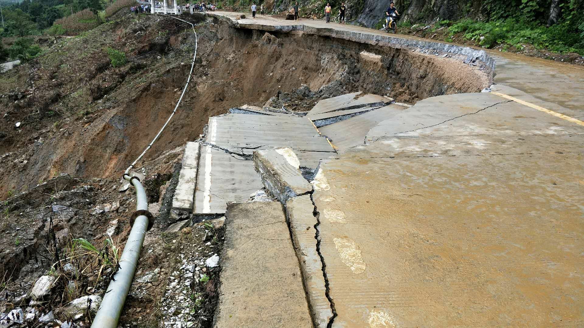 6. 那坡公路管理局管养的国道219线喀纳斯至东兴K9458+856(原s325线K624+300那坡县平孟镇路段),2018年8月3日15时30分受连续大暴雨影响,造成路面塌陷(长12米,宽8米),导致交通中断,目前无车辆滞留,无人员伤,现已在中断路段两头设置好交通告示牌及安全标志,无绕行路线。由于路基下存在溶洞,灾情仍在发展,无法马上进行抢修,目前无法预计通车时间。