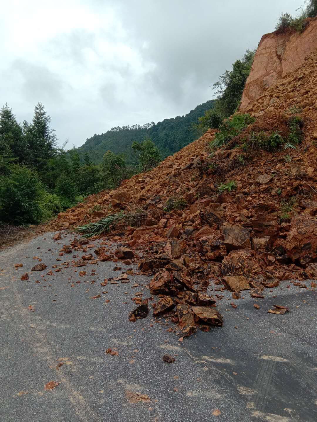 4.那坡公路管理局管养的国道219线喀纳斯至东兴(原s320线632+450那坡县平孟镇规劳屯路段),2018年8月3日14时10分受大暴雨影响,造成上边坡塌方约2160立方米,导致交通中断,目前无车辆滞留,无人员伤,现已在中断路段两头设置好交通告示牌及安全标志,提醒往平孟镇车辆绕国道219喀呐斯-东兴通行。由于现场存在安全隐患,无法马上进入现场抢通,预计通车时间2018年8月5日上午11点。