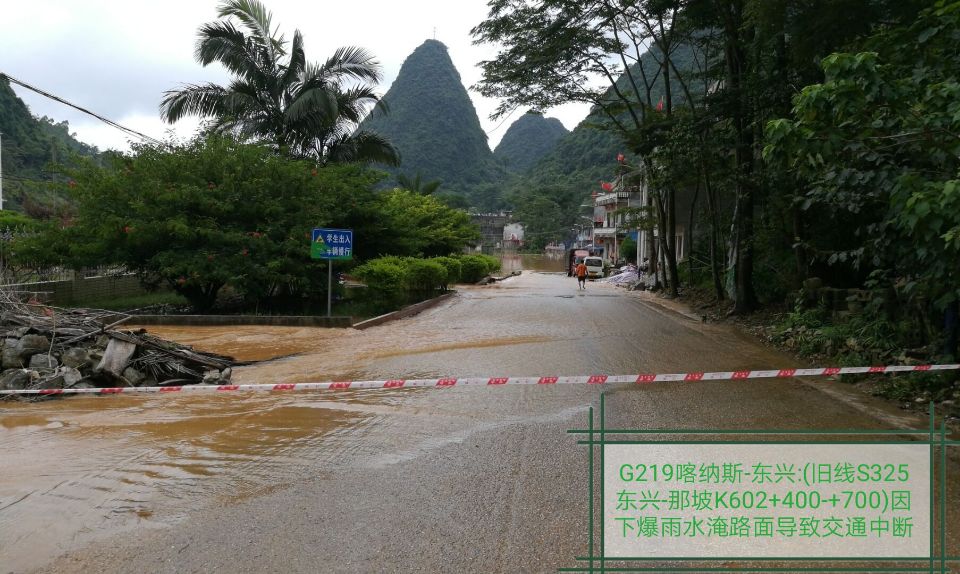 5.2018年08月03日11时40分靖西公路局管养的国道219喀纳斯-东兴(旧省道325线K602+400-K602+700)处(吞盘乡孟麻街)路段,因下大暴雨水淹路面长300米、深约2.0米,导致交通中断。 现已在中断路段两头前方各设置好交通告示牌及安全标志,提醒往靖西方向的过往车辆绕道三那线(X775)、新富线(S320)公路行驶;往那坡方向的过往车辆绕道祥龙线(S210)、新富线(S320)公路行驶。目前养护部门正在组织机械、人工抢通。由于该路段处于低洼路段水淹较深,排水出口较小,降雨持续,无法预计恢复通车时间。
