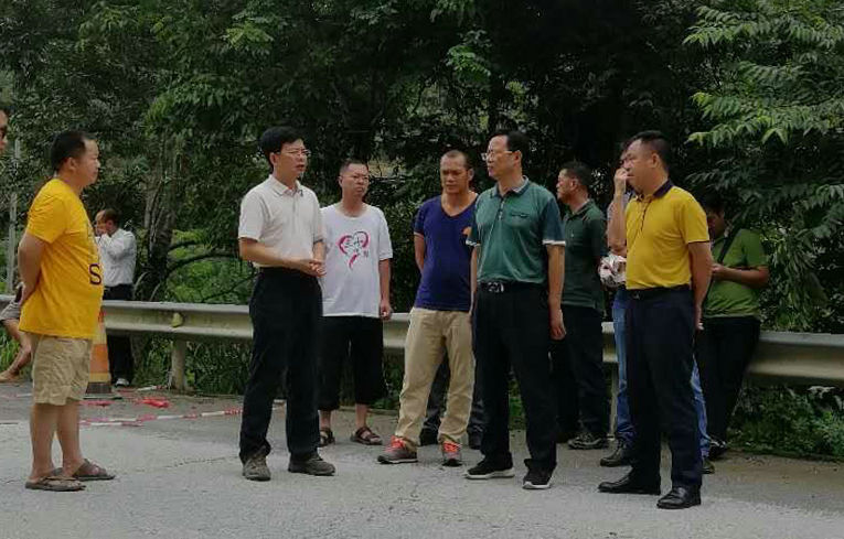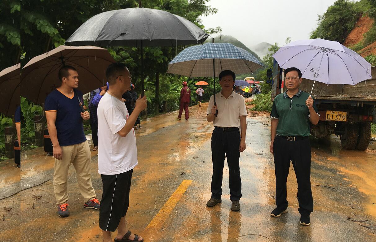 ▲罗试坚副市长(右二)亲临G212线乐业至永乐公路K130+200处视察灾情