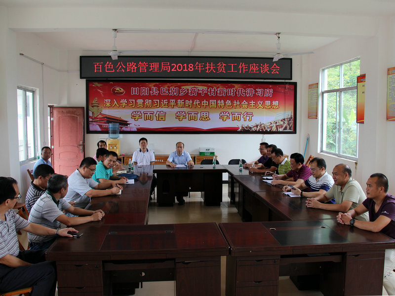 当日,完成走访工作后,该局在新平村村部召开座谈会,该局领导及相关科室负责人代表、巴别乡人民政府、新平村驻村帮扶工作队、双挂单位负责人等参加座谈会。会议首先听取该局选派驻村第一书记巫伟康就2018年上半年扶贫工作开展情况、取得的成绩以及存在的困难问题等作的汇报,并就当前存在的困难问题进行讨论分析,研究探讨解决问题的方法办法并制定措施。最后,百色公路管理局副局长陆地康进行总结发言,他充分肯定扶贫工作取得的成绩,认为新平村的扶贫工作已初见成效,同时强调今后的扶贫工作要抓住重点、突破难点,继续努力、攻坚克难,坚决打好打赢脱贫攻坚战。