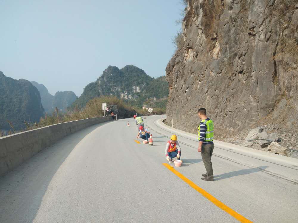 ▲养护人员在K2218+600凌云县百朝屯处重新画交通标线(萧国盏 摄)