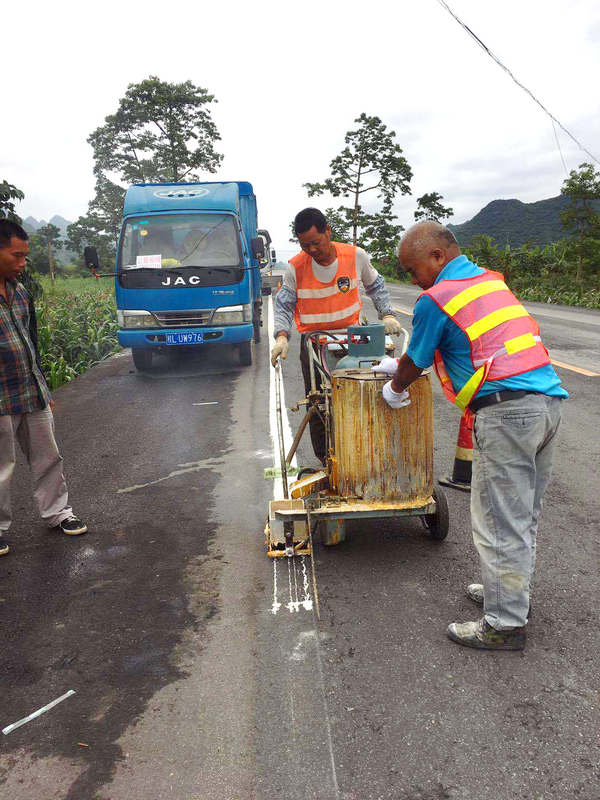 2019年5月22日,田东公路管理局深入推进百日攻坚活动,图为施工人员完善缺损公路标线。