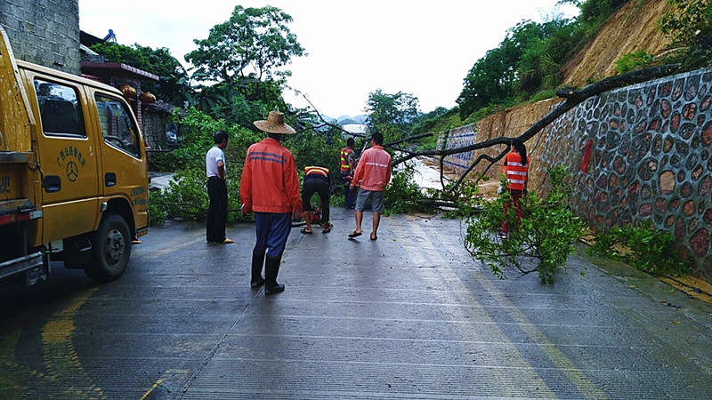 2019年6月13日,平果公路管理局组织人员清理S215线因强降雨倾倒的路树,保障公路畅通。