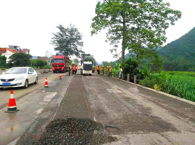 据悉,今年上半年以来,田东雨水较多,加之G324线车流量大,部分路面不堪重负,出现网裂、坑槽等病害,影响了行车的安全性和舒适性。处治过程中,施工人员严格按照施工技术规范对路面病害进行铣刨路面修复,即:通过铣刨机对旧路面病害铣刨20㎝(局部就地冷再生基层20㎝),填充粗骨料后洒水碾压形成新基层,再铺装沥青面层以提高平整度,确保行车的安全和舒适。同时按要求正确布设作业区安全标识,加强养护安全设施保护,确保路面病害修复工作有序开展。