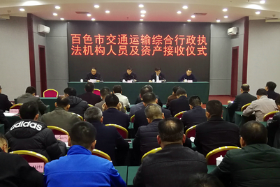 2020年1月21日,百色市人民政府在百色市举行全市交通运输综合行政执法机构人员及资产接收仪式,百色市人民政府副市长莫前锋,市委组织部、市委编办、人力资源社会保障局、财政局、审计局、国资委,市交通运输局、自治区百色公路发展中心及各有关县(市、区)公路养护中心和路政执法大队、各县(市、区)人民政府、交通运输局等相关单位参加仪式。