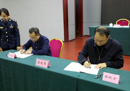 2020年1月21日百色市交通运输局局长龙宗福(右一)与自治区百色公路发展中心副局长陆地康(左一)签署百色市交通运输综合行政执法机构接收协议书(覃微 摄)