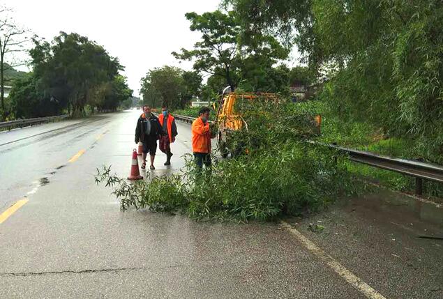4月22日,汛期来临,平果公路养护中心加强公路巡查和养护力度,及时清理涵洞淤塞和倒伏路树,保障公路安全畅通。图为养护人员清理G324线K1798+650因大雨倒伏路树。