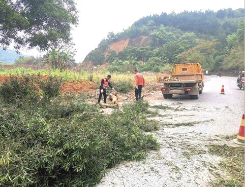 处路树倒伏,占据半幅公路,影响公路交通。该中心立即组织养护站人员将树干、树枝割断,清理路面上的树枝和树叶,保障行车安全。