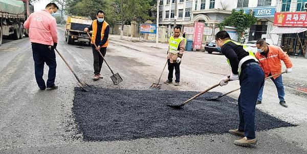 国道324线田东路段路面受路基结构、交通量大、重车多等因素影响,路面多处出现严重裂缝、坑槽等病害,对过往车辆和行人造成一定的安全隐患。为保障百姓出行安全,消除隐患,1月26日,田东公路养护中心组织公路养护一线工人对国道324线路面坑槽进行修补,确保春运期间公路安全畅通。