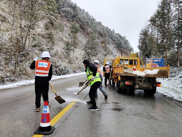 从2月19日晚开始,西林县出现低温雨雪冰冻天气。为加强雨雪冰冻天气道路安全保通工作,根据上级工作部署,西林公路养护中心迅速启动雨雪低温天气应急预案,有序开展应急指挥、应急处置、路面巡逻、隐患排查、宣传提示等工作措施,确保期间道路交通安全顺畅有序。