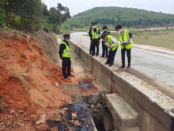 接到信息后,该中心立即通过执法、养护协作工作微信群向交通运输综合行政执法部门报送案件信息,并一同前往现场进行勘验。经双方共同勘验,此次大货车发生侧翻,造成公路路面污染78平方米,损坏土质路肩5.5平方米、浆砌水沟2米、排水系统4.5米,路产路权遭受巨大损失。可当事人已不在现场,针对此情况:一是由公路部门询问养护工人,寻找路过群众,查找当事人。二是由交通运输综合行政执法部门与交警部门沟通,查找当事人相关信息,以便快速、准确的找到当事人,进行路产路权的追偿。
