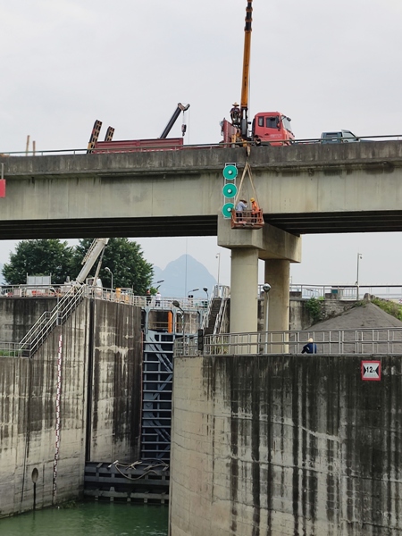 施工当日,工程技术人员和工人经过十余小时的紧张工作,在夜幕降临之际,完成在大桥7#、8#桥墩的两端上下游安装桥柱灯,经调试成功点亮,为船舶指明通过桥下的可航行水域通道,减少与桥墩或桥梁上部结构相碰撞的可能性,确保桥梁本身和船舶在桥下航行的安全,那吉大桥夜间通航安全能力进一步得到提升。