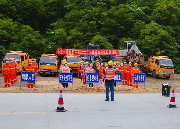 演练制定了详细的活动实施方案,成立指挥部,指挥部下设交通安全保障组、公路抢修组、后勤保障组、公路信息发布组以及观摩组等五个小组并详细分工,明确岗位职责。现场指挥长下达启动演练指令后,各组成员闻令而动,各司其职,有序开展汛期公路塌方突发事件应急处置演练科目。交通安全保障组成员迅速在演练路段两头布设公路抢险作业标识标牌,有序引导和疏散社会车辆安全通行;公路抢修组成员启动各种抢险作业机械有序进入指定作业区域;后勤保障组成员负责调配和发放应急抢险保障物资、机械设备;公路信息发布组成员对抢险现场进行拍摄,记录和保存有关抢险资料,做好向有关部门报告和信息发布准备。
