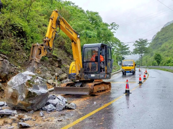 三是及时组织人力机械到场进行清理,通过挖掘机安装破碎锤对巨石进行分解,再利用铲车搬运,及时消除巨石,保障道路安全畅通。