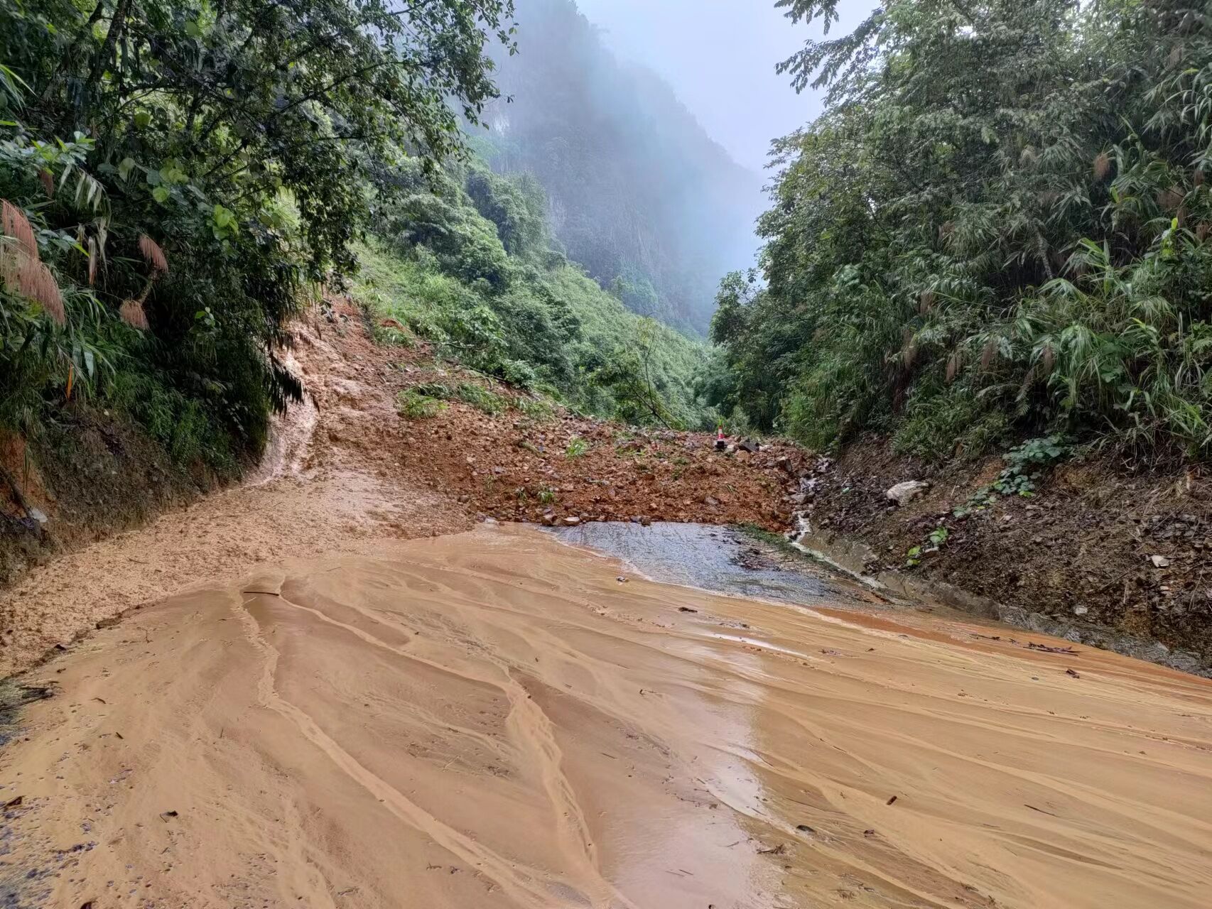 2022年5月25日9时40分,因受强降雨影响,那坡公路养护中心管养的G219线(喀纳斯至东兴)K9415+920那坡县百南乡上隆村坡壮屯路段上边坡发生泥石流,泥石覆盖整幅路面导致交通中断。