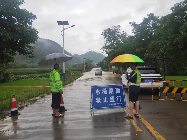 6月5日上午11时许,田东公路养护中心接到电话通知,称受强降雨影响,印茶镇镇区河道泄洪能力不足,G243线(开县-凭祥)K1583+900至K1584+500(印茶桥至印茶二小路口)路段水漫路面,长约600米,水深约80cm,造成交通中断。