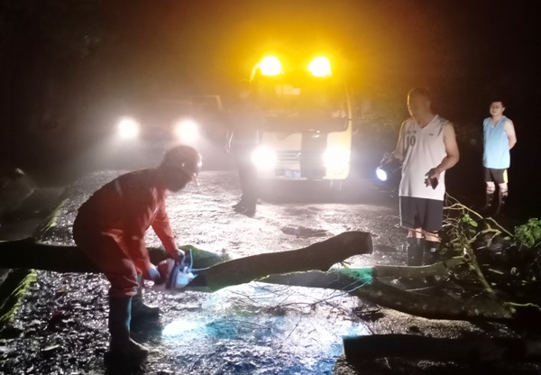 2022年6月23日凌晨2时30分许,受暴雨影响,靖西公路养护中心管养的国道219线K9521+380处发生一大棵路树倒伏,覆盖整幅路面,造成该路段交通受阻。接到险情报告,靖西公路养护中心立即启动汛期公路突发事件应急预案,迅速组织龙邦养护站职工赶赴现场连夜抢险,同时联合靖西边境管理大队龙邦边防派出所和龙邦镇介邦村村干联合开展处置工作。到达现场后,抢险人员摆放安全标志,随即对路倒伏路树进行处置。经过一个小时的努力,于6月23日凌晨3时30分将倒伏的路树、散落在路面上的树枝清理干净,及时消除该路段交通安全隐患,切实保障人民群众平安出行。