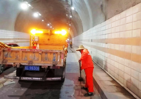 一是严格按照公路隧道养护技术规范狠抓隧道日常养护,切实提高隧道管养品质。采取“人工清扫+机械清扫”的模式,定期对管养隧道进行清洗、清扫,及时疏通隧道进出口路段的边沟等排水系统。