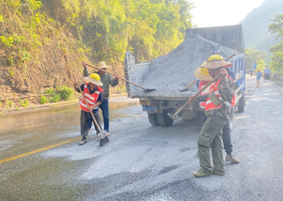 针对这一突发情况,田阳公路养护中心立即启动“公路突发事件应急预案”,组织应急队员和机械组第一时间赶赴事故现场。抵达现场后,应急队员首先在公路两头设置安全交通标志牌、安全筒等警示标志,并在交警部门的协助下维护好交通秩序,避免大面积拥堵。随后,集中所有机械和应急队员第一时间对被油污的路面进行撒料后清扫,反复作业直到路面恢复整洁。经过养护部门的有序快速的应急处置,省道306线于当晚19时45分恢复通车。