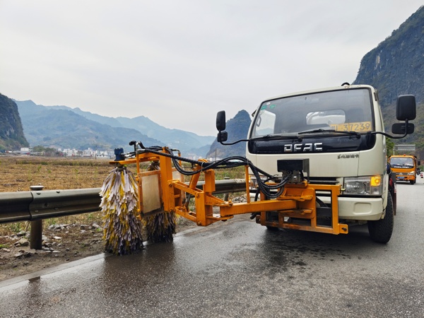 平果公路养护中心所管养线路中现有波形防护栏路段共计里程32.7公里。当前防护栏的清洗仍然采用人工清洗,劳动强度大,清洗效率低,养护工人在公路两侧清洗防护栏也存在安全隐患。