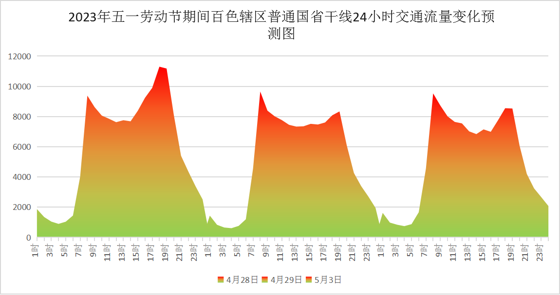 2023年“五一”劳动节假期期间百色市辖区普通国省干线公路24小时交通流量预测如下图所示: