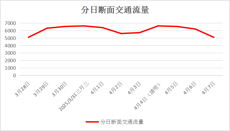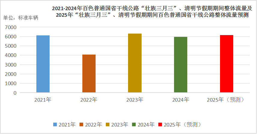 通过建模2021-2024年“壮族三月三”、清明节假期期间百色国省干线公路相同路段整体交通量变化趋势,结合当前旅游市场形势、高速公路、高铁和经济社会发展及人民群众出行意愿,分析预计2025年“壮族三月三”、清明节假期期间百色普通国省干线公路日均交通流量将达到约6000标准车辆,同比增长约2%,普通国省干线日均整体断面交通流量略高于去年同期水平。
