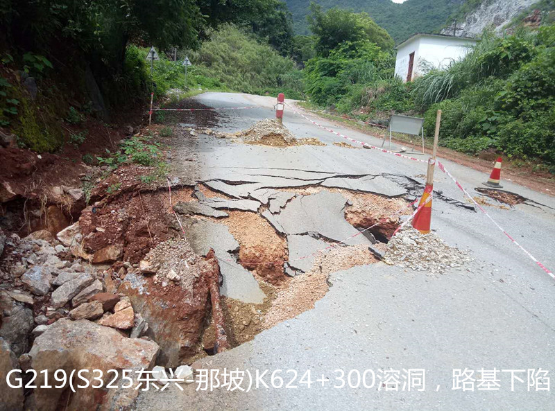 6. 那坡公路管理局管养的国道219线喀纳斯至东兴K9458+856(原s325线K624+300那坡县平孟镇路段),2018年8月3日15时30分受连续大暴雨影响,造成路面塌陷(长12米,宽8米),导致交通中断,目前无车辆滞留,无人员伤,现已在中断路段两头设置好交通告示牌及安全标志,无绕行路线。由于路基下存在溶洞,灾情仍在发展,无法马上进行抢修,目前无法预计通车时间。