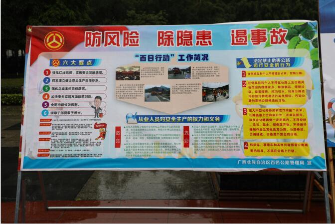 作为百色市安全生产委员会的成员单位,该局积极响应,紧扣活动主题 ,结合本单位实际设置安全宣传展板,发放安全手册、安全传单、印有安全生产标语的安全宣传袋和安全知识小扇子等形式,向过往的群众宣传《公路法》相关知识和交通、地质危害等方面的安全知识。期间,百色市人民政府常务副市长石国怀到该局展位指导工作,详细了解该局安全生产和雨季安全保通的相关工作,要求该局做好安全生产月的咨询工作,积极应对雨季水毁抢通保通工作。