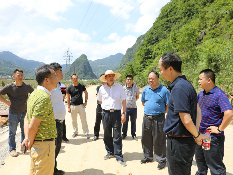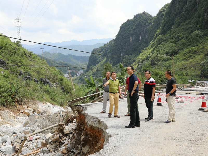 灾情发生次日,自治区交通运输厅罗伟副巡视员、自治区公路管理局姜永春局长等领导一行在百色公路管理局陆地康副局长的陪同下到公路水毁一线察看灾情并指导抢险工作。罗伟副巡视员一行现场察看了G212线K2254+890~K2255+300(百色市凌云县下甲镇伶站乡弄孟村公路)路基缺口路段,听取了百色公路部门的抢险工作汇报,并对该路段水毁抢修工作提出了3点要求:一是要保证抢险保通队伍的人员、机械安全,杜绝次生灾害的发生。二是要结合道路承载能力和具体路况,合理制定断通道路绕行方案。三是要根据道路地形,积极与有关部门配合,科学制定灾后重建方案。自治区公路管理局姜永春局长要求百色公路管理局要迅速部署,抓紧抢修便道,尽快恢复通车。