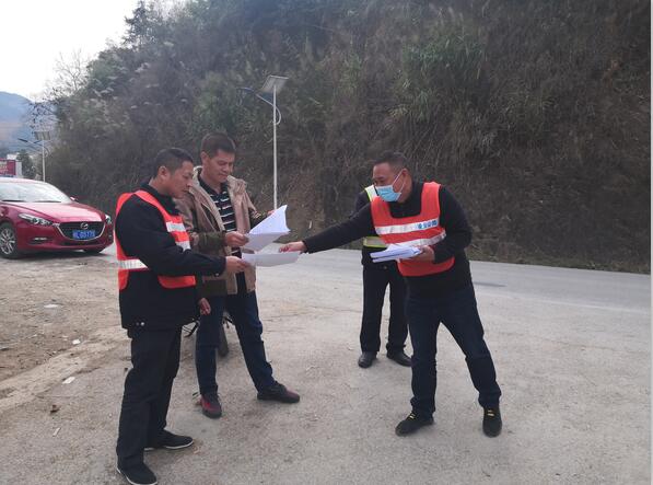 凌云公路养护中心按照上级部门和凌云县政府疫情防控的工作部署,积极开展各项防御工作,全力做好各项防控措施和应急准备工作,图为该中心工作人员发放疫情防控宣传单。