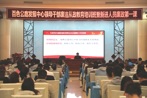 为推动全中心党风廉政建设和反腐败工作再部署、再出发、再深化,进一步增强全体干部职工拒腐倡廉的意识。11月17日,百色公路发展中心举办2020年度领导干部廉洁从政教育培训班暨新进人员廉政第一课,各县(区)公路养护中心领导班子成员、各单位全体新进工作人员和市中心全体干部职工262人参加培训。