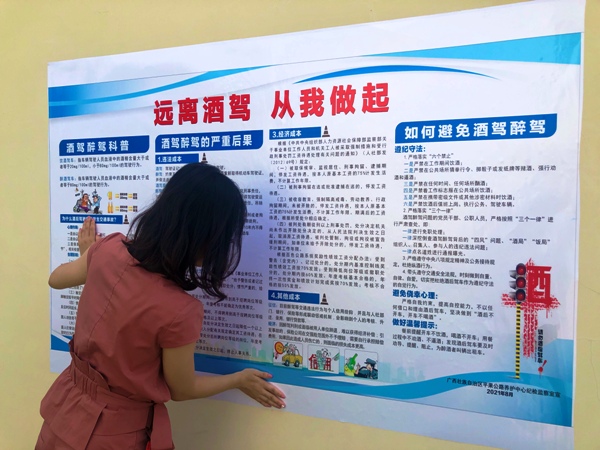 张贴海报,广泛宣传。该中心在各养护站显眼位置张贴了“远离酒驾,从我做起”的主题宣传海报,并向职工发放拒绝酒驾宣传单100余份,要求他们从自身做起,克服侥幸心理,时刻紧绷“喝酒不开车,开车不喝酒”这根弦,坚守底线,不碰红线,做到对自己、对家庭、对单位、对社会负责,带头遵纪守法,杜绝酒后驾车。