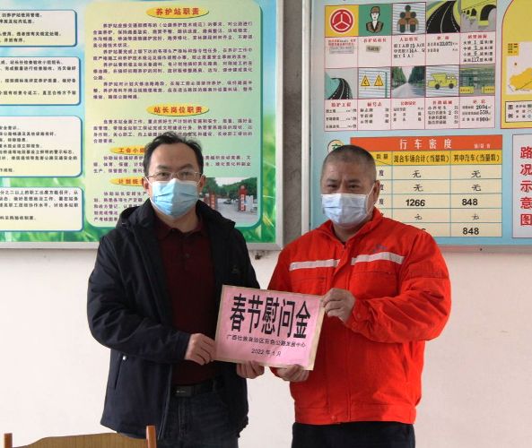 赵天峰副主任一行先后到平坡养护站、田阳中心机大院走访慰问一线养护工人及困难职工。给他们送去慰问金,并与职工们聊家常、谈工作,对这些临年春节仍然辛勤工作在一线的干部职工表示感谢,也对他们为公路事业发展做出的贡献给予肯定和赞赏。同时,要求各基层站所职工们继续发扬铺路石精神,始终鼓足干劲不懈怠,做好春节期间值班值守及春运保通保畅工作。
