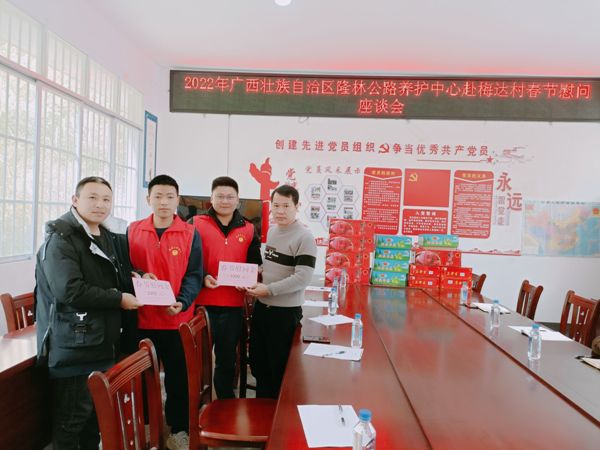 2022年1月24日,隆林公路养护中心党总支副书记一行5人,前往梅达村定点帮扶贫困村对驻村工作队员开展春节前走访慰问活动,并调研了解定点帮扶村乡村振兴工作情况。