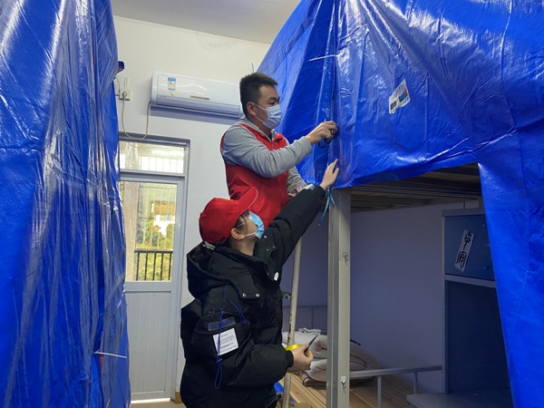 了解到百色学院澄碧湖校区隔离用房布置人手紧缺的情况下,党支部主动对接学校,由中心党员同志带头报名,成立了右江公路养护中心机关与养护党支部抗击疫情志愿服务队。来到学生公寓后,志愿者们搬运隔离用品至指定位置,用塑料防雨布将学生物品与要留空的隔离床分开来,4人为一小组,分工协作,步骤明确,剪裁、拼接、扎带,经实践操作,变成了“熟练工”,到场的志愿者们大家不怕苦、不怕累,认真高标准的完成学校交给的任务。截止目前,共独立布置学生宿舍18间,期间还协助检查宿舍40间,为百色疫情防控隔离建设贡献了公路人的力量。