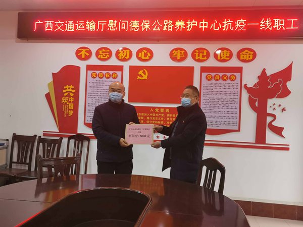2月16日上午,广西交通运输厅党组成员、总工程师陈津维一行来到德保公路养护中心,代表广西交通运输厅、广西交通工会慰问疫区一线的公路职工,并送来慰问金。