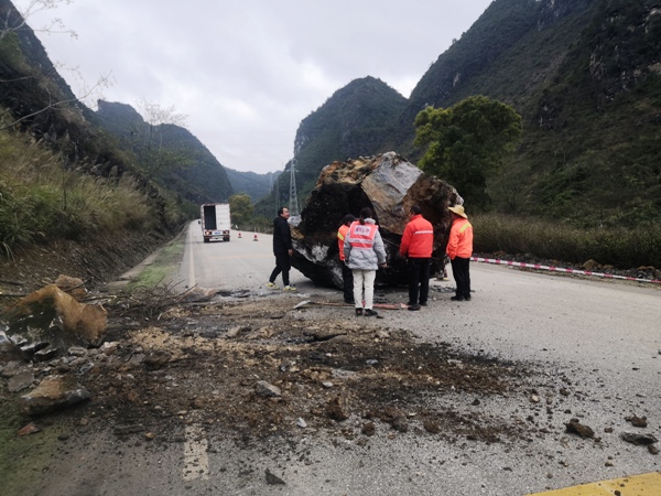 接群众报告后,靖西公路养护中心立即组织10名养护人员及机械赶到现场处置。为尽快让该路段恢复正常通行,在设置好安全标志后迅速开展清理工作,现场作业的养护人员立即分工协作,冒着寒风一边疏导交通,一边快速进行清理。经过连续6个多小时的奋战,将落石清理完毕,该路段也恢复了正常通行。由于处置及时,此次山体塌方落石未引发交通事故和交通阻塞。