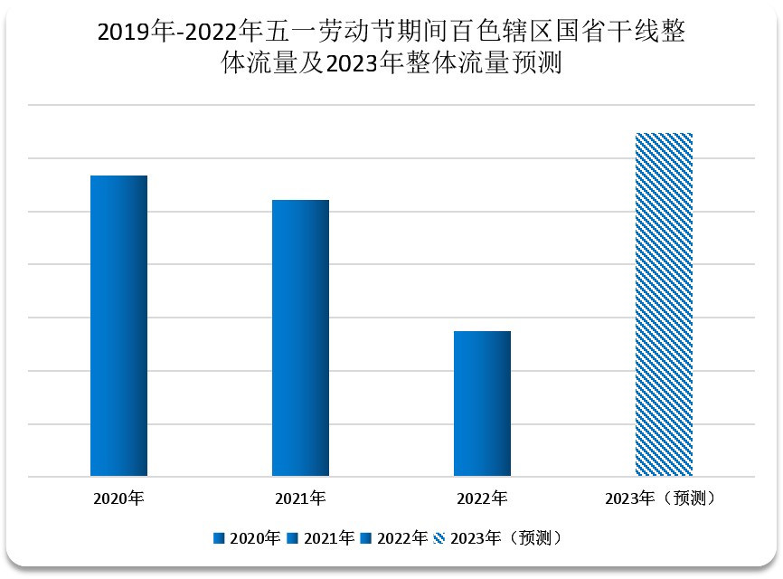 2020-2022年“五一”劳动节假期百色市辖区普通国省干线整体流量及2023年预测如下图: