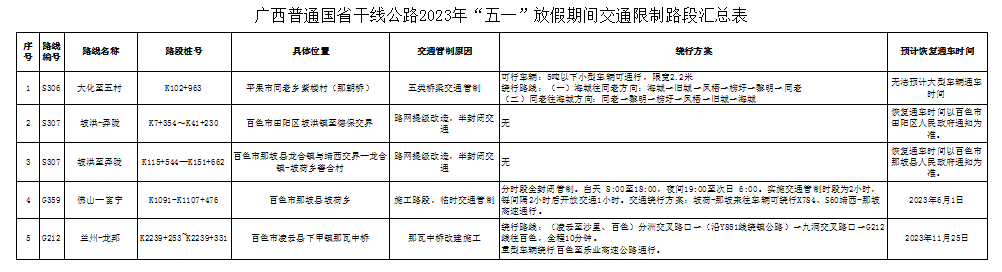 百色市普通国省干线公路2023年“五一”劳动节放假期间交通限制路段汇总表