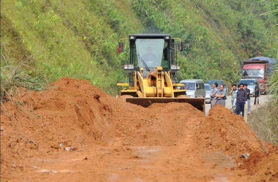 10月2日上午8时左右,那靖线K153处再次发生上边坡大面积塌方约1000立方米,造成路面堵塞交通中断。此时正值国庆长假旅游高峰期,抢通工作刻不容缓,该局领导迅速加派人员及机械赶赴该路段投入清理保畅工作中。由于加大抢通力度,于当日10:10比预计时间提前恢复了通车,确保了节假日期间道路安全畅通。