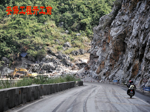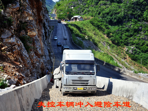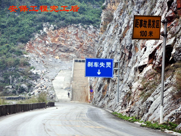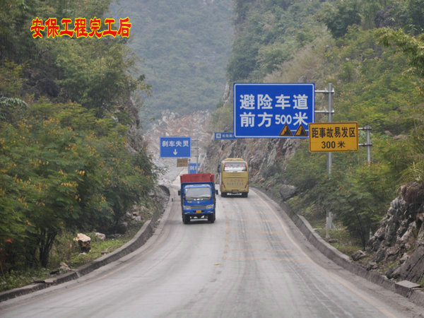 省道210线祥周至龙邦二级公路是连接德保、靖西、那坡三县的主要交通要道,车流量大,且重车多。该线路布兵坡路段(K7+000~K16+000)属于山岭重丘区,坡陡且长、连续急弯、路面狭窄,车辆因刹车制动失效造成交通事故频发。近年来,公路部门实施了一系列安保工程项目进行整改:一是2009年10月投资95.67万元,在S210线K8+000布兵路段修建避险车道、施救平台、临时停车场以及增设标志标线警示标牌等;二是于2012年8月投资361万元,扩建K8+000避险(自救)车道,将K10+700和K14+100两处进行急弯截弯改直,增设一行驶车道;三是近年来S210线K8~K16安保工程项目新建砼防撞墙5780米,波形防护栏950米,增设钢筋混凝土防护栏附着式轮廓标354个、连续弯道标志牌8块,落石标志牌6块和热熔型振动减速带587㎡,在K10+450和K14+100处设置道路广角镜,总投资539.4万元;四是近段时间投资5000元分别在S210线K7+000和K15+900处设置温馨告示牌,同时在K7+000~K16+000路段弯道两端设置落石安全告示牌38块,修复损波形防护栏40米。