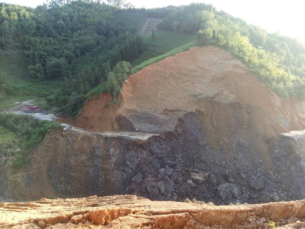 西林县城至八大河二级公路土黄至八大河三期工程受台风及连日来持续降雨的影响,山体吃水饱和,导致该工程№10项目合同段马蚌坳K64+400左侧边坡连同行车道于2016年8月24日17时整体坍塌,造成交通完全中断,预计抢通时间为5天。由于该路段目前尚无便道,过往车辆需要绕行罗平往广南或兴义往隆林方向通行。