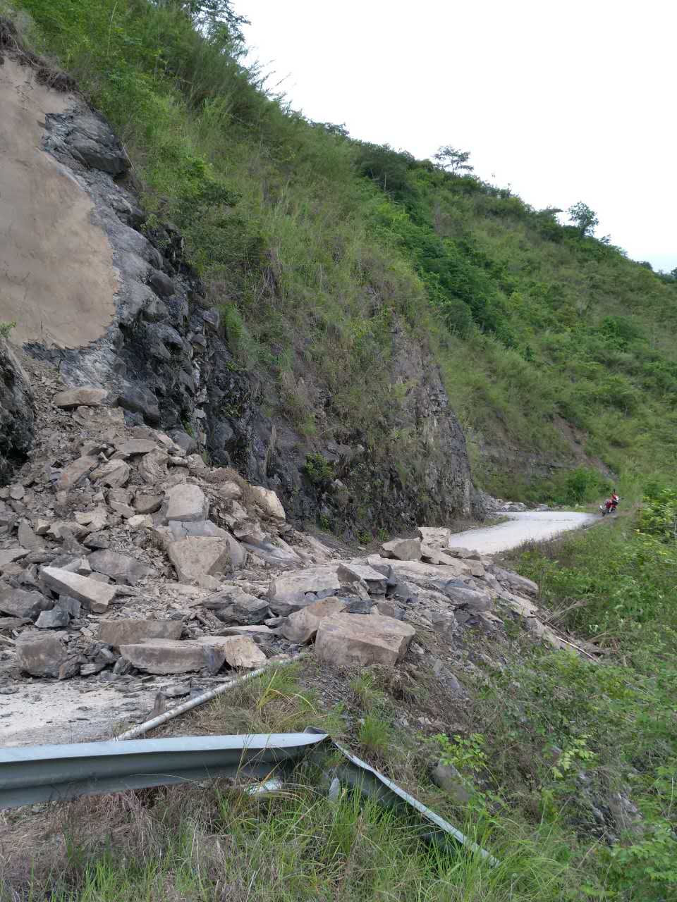 2017年6月29日8时50分,省道217线旧州~富宁 (田林县定安镇央荣村)路段,因下暴雨上边坡塌方覆盖整幅路面,导致交通中断,现已在中断路段两头设置好交通告示牌及安全标志,提醒往央荣村方向的车辆绕乡村公路平塘-隆林介廷、隆林介廷-定安行驶。目前养护部门正在组织机械、人工抢通,预计6月29日13时30分恢复通车。
