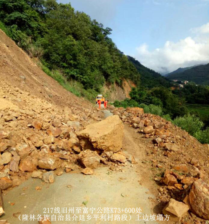 3.隆林公路管理局管养的S217线旧州至富宁公路K73+600处(隆林各族自治县介廷乡平利村路段)10时50分发生上边坡塌方,泥石流覆盖全幅路面造成断通。