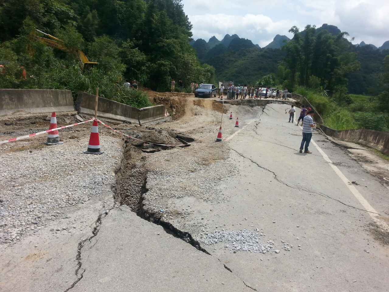 2017年7月7日12时,靖西公路局管养的国道212兰州至龙邦(旧省道210线K139+500~K139+600)处(地州乡卜坡村)路段,因连降暴雨路基全幅整体下滑,方量约17000立方米,导致交通中断。现已在中断路段两头前方各设置好交通告示牌及安全标志,提醒从龙邦往靖西,靖西往龙邦方向的车辆绕道S325线行驶。目前养护部门正在组织机械、人工抢通,由于地势复杂,抢修难度大,无法预计通车时间。