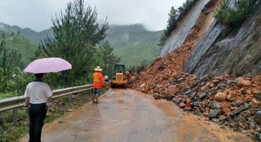 德保公路管理局管养的国省307线K29+700~K29+750处(德保县敬德镇和平水库)路段,2017年07月11日8时因下暴雨上边坡塌方覆盖整幅路面,导致交通中断,养护部门正在积极组织机械、人工抢修,预计于2017年07月11日15时恢复通车。