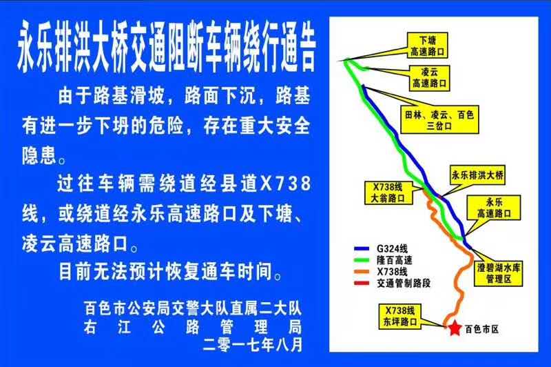 右江公路管理局已设立公示牌提醒过往小型车辆需绕道经X738线,或绕道经永乐高速路口及下塘、凌云高速路口;大型车辆需绕道隆百高速公路。