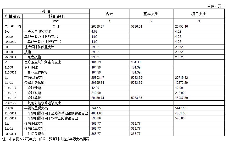 截至2016年12月31日,本部门共有车辆279辆,其中,部级领导干部用车0辆、一般公务用车109辆、一般执法执勤用车0辆、特种专业技术用车97辆、其他用车73辆,其他用车主要是养护用车;单位价值50万元以上通用设备0台(套),100万元以上专用设备1台(套)。